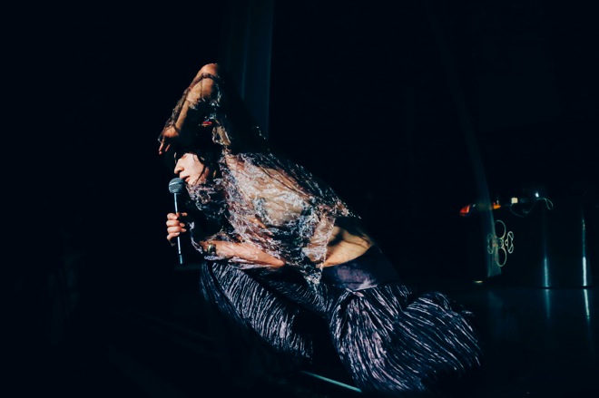 開演予定時間を15分ほど過ぎたタイミングで場内が暗転。オープニングを飾ったのは「雪男イエティ」。「今晩は! お待たせしました!」と叫ぶコムアイの声が聴こえる。やはりというべきか、ステージにコムアイの姿はなく、その行方は2階席にあった。白いモップをまとったコムアイはイエティを引き連れている。鉄柵に身を乗り出し、オーディエンスに向かって「今からそっちに行くから!と宣言。コムアイはイエティとともにフロアを練り歩きながらステージへ。