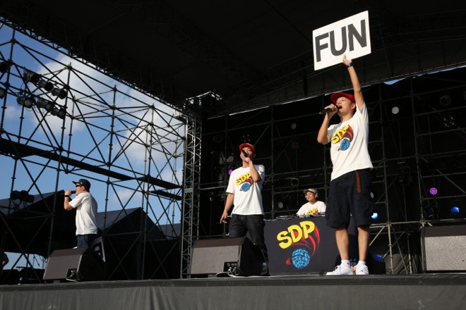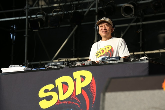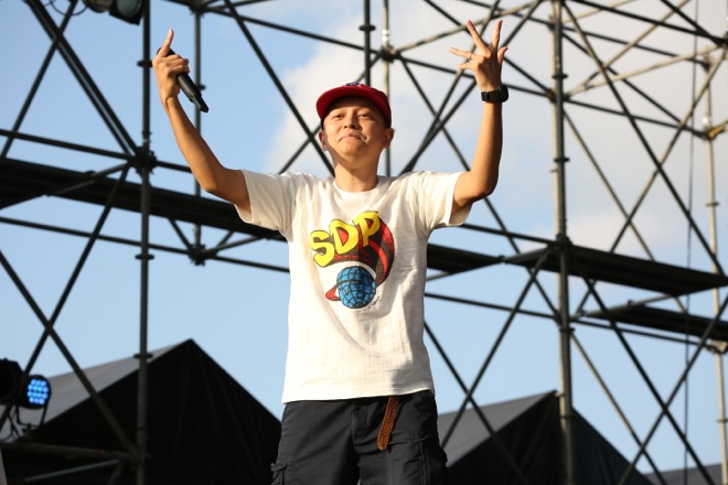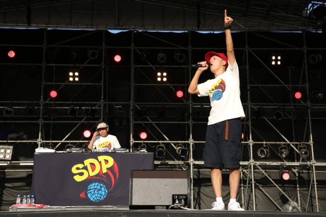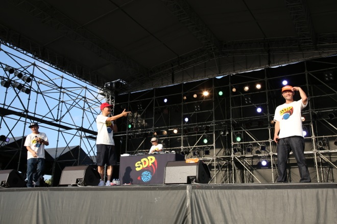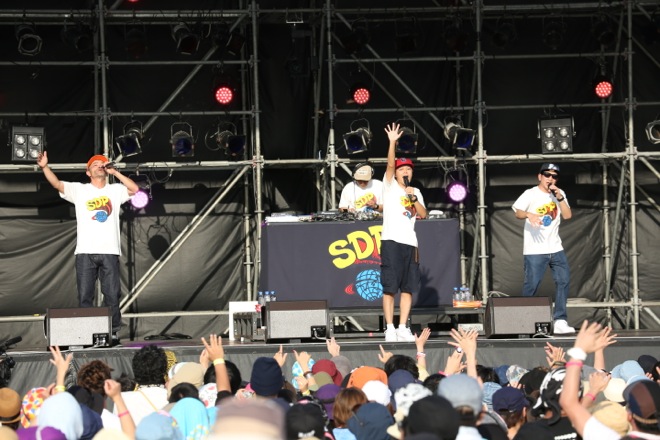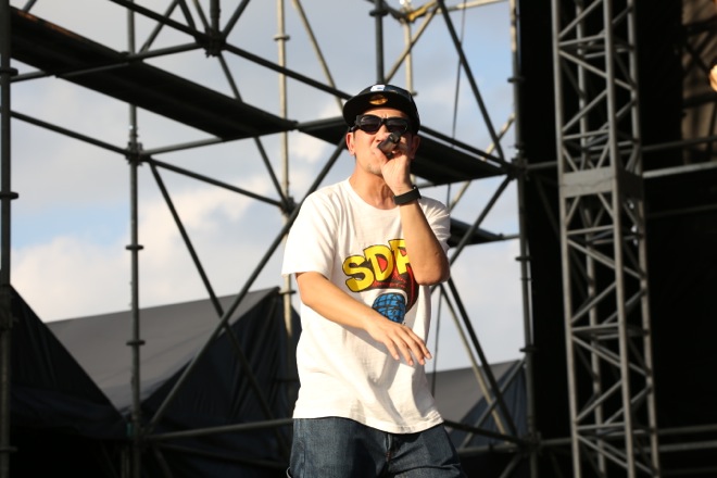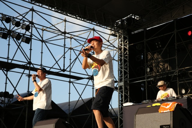 サンボマスターの時は「熱い!」と感じていた太陽が、DJ SHINCOが曲を流し始める頃にはいい感じに傾いてきて、海から涼しげな風が吹いてきた…ように感じた。決してビートは柔らかいわけではないのだけど、スチャダラパーはその場の空気をまろやかにしてくれる。
