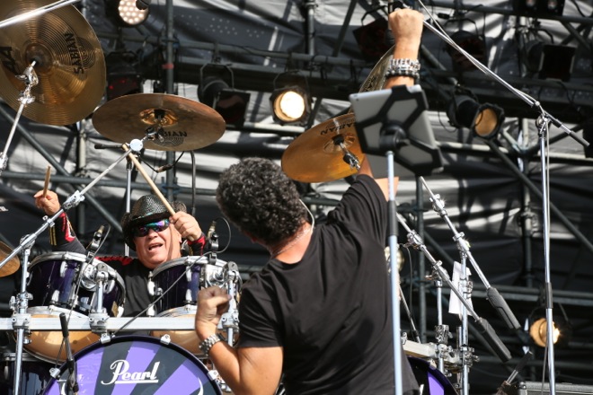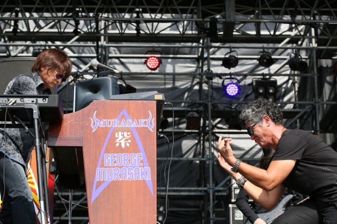 早速、その新譜から「Heaven’s Gate」「Red Line」を演奏。新曲にもかかわらず、懐かしさも感じる安定感の中に“今”が詰め込まれたようなサウンド、その唯一無二の存在感にテンション上がる。最前列には紫と同世代と思われるファンが恍惚の表情でステージを見つめていたり、一緒に口ずさんだり、明らかに紫を知らない若い層が拳を突き上げて吠えていたりと、世代を超えて聴衆を魅了するパワーが全開だ。