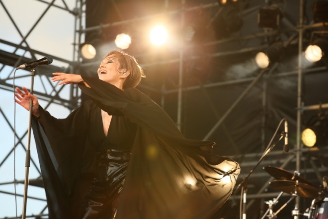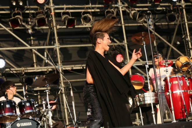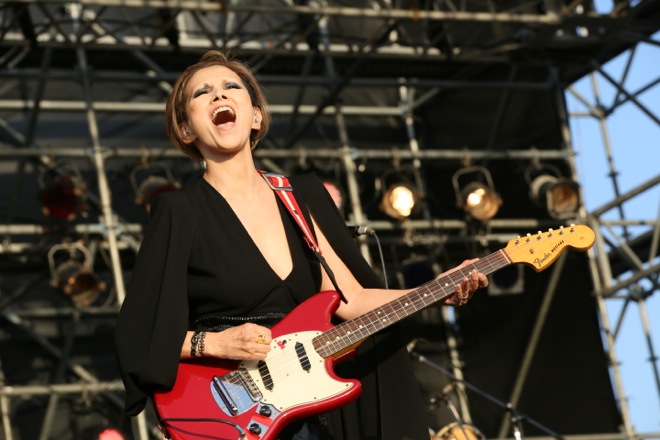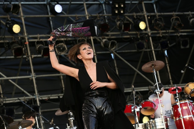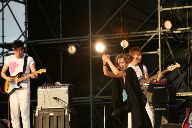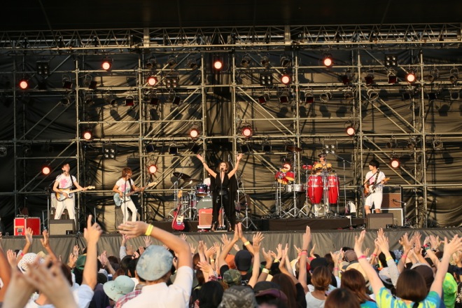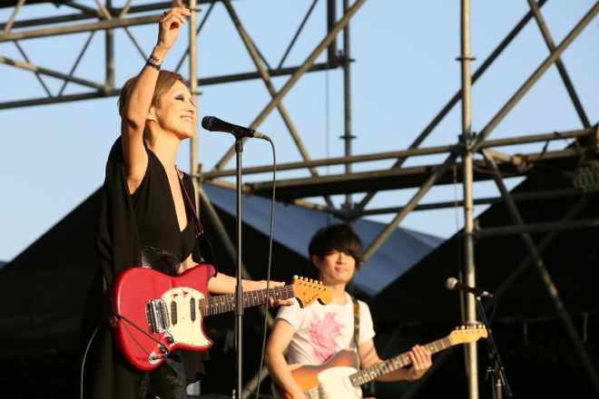16時45分、まだまだ暑いステージに、胸元と背中が大胆に開いた妖艶な黒の衣装で登場した夏木マリ。「沖縄!姉さんがきたよ!」と拳を振り上げ、ギターを手に、いきなり激しいロックチューン「Happy Together」からライヴをスタートさせた。うだるような沖縄の暑さに弛緩しかけていた神経が叩き起こされるようなサウンドだ。