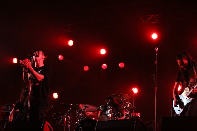 「晴れてよかった。お月様とジェット機の下で、BRAHMAN始めます」とのシャウトと同時に、オープニングとは打って変わって攻撃的なサウンドを客席に突き刺す。「賽の河原」「SEE OFF」「DEEP」「BEYOND THE MOUNTAIN」と、途切れなくヒットメドレーさながら続くハイテンションな曲の連続に、当然のようにモッシュが始まる。観客のボルテージは最高潮に達し、スタンディングゾーンは押し寄せる人波で埋まっていた。