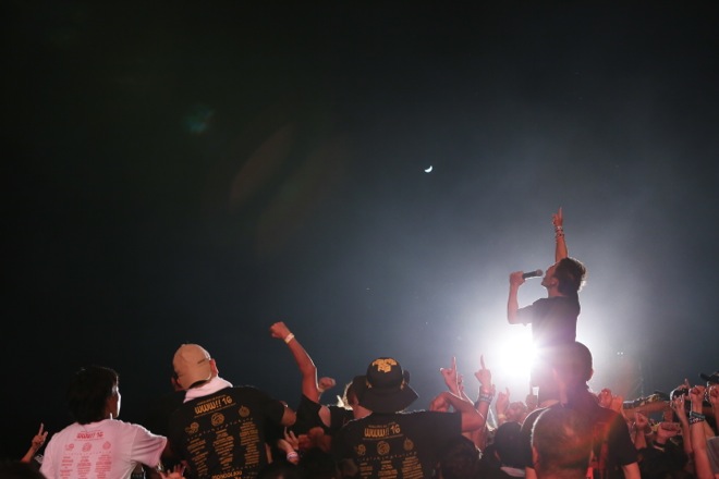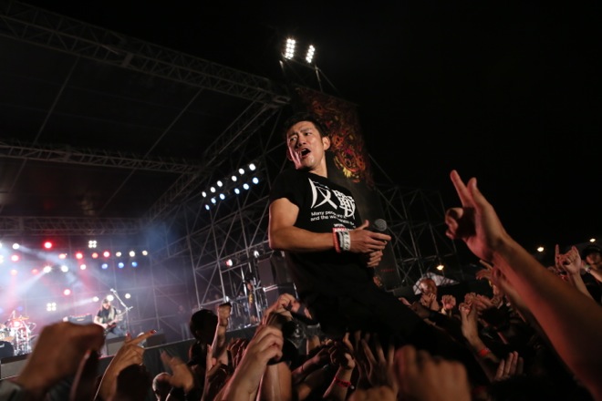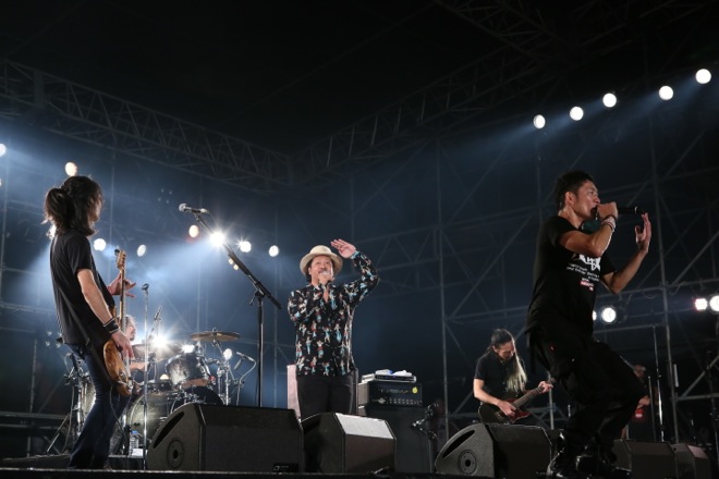 「ベトナム戦争ではバリー・マクガイア。チェルノブイリの時には清志郎とかさ。必要な時に時代の叫びとして歌われた歌がある。だから俺は、そんな歌を2016年の“今”歌う必要があると思うから歌う」と嘆くように、しかし力強く前を見据え、「明日なき世界」を歌い始めた。曲の序盤、TOSHI-LOWのあおりに導かれた、「やせっぽっちじゃない」キヨサクがステージに登場。TOSHI-LOWもステージに戻り、二人は力の限り声を振り絞った。曲中では「オスプレイ」や「基地」など、今の沖縄が抱える問題をストレートに表す言葉に言い換えて、「今必要な」明日なき世界を作り上げていくTOSHI-LOWとキヨサク。沖縄の言葉で「嘘」という意味を持つ「ゆくし」という単語が、キヨサクの口から何度も飛び出した。