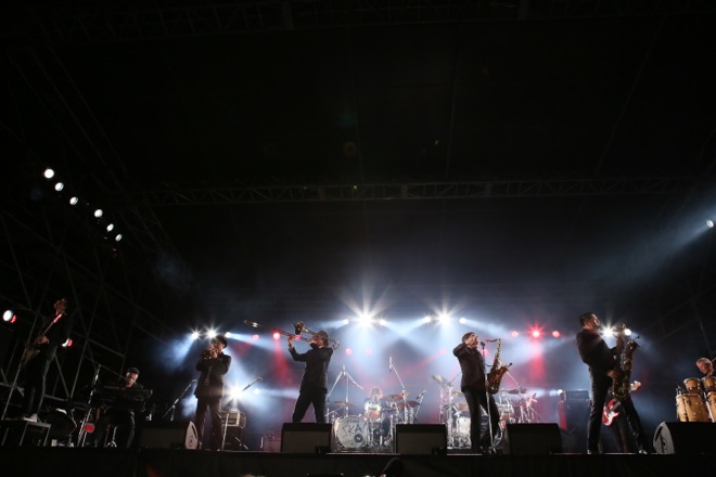 太陽が沈み辺りがすっかり暗くなった頃、蒼く照らされたステージに立ったのは、1日目のトリを務める東京スカパラダイスオーケストラだ。