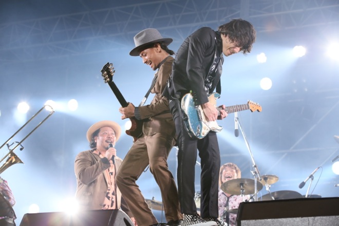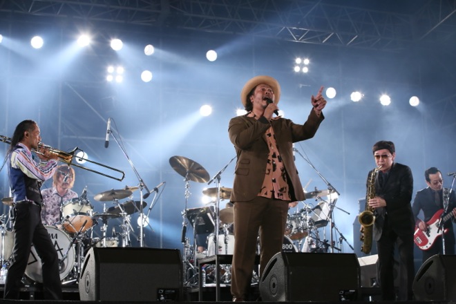 オープニングナンバーの「Paradise Has No Border」からエンジンがフル回転、谷中敦(Baritone sax)が「We Are 東京スカパラダイスオーケストラ!」と、高々と告げた。そのエンディングで暗転したステージに再び照明が当たり、そこに登場したのは白いTシャツにオーバーオール姿のTAKUMAだ。10-FEETとのフィーチャリング曲「閃光 feat.10-FEET」披露は、「このステージ直前に決まった」というオーディエンスにとってはうれしすぎるサプライズ。また、間奏部分での“♪島唄よ風に乗り What a Wonderful World 調子はどうだい!?”といった名曲「島唄」の即興アレンジは、スカパラメンバーさえ聞かされていなかったTAKUMAによる正真正銘のアドリブだったらしい。