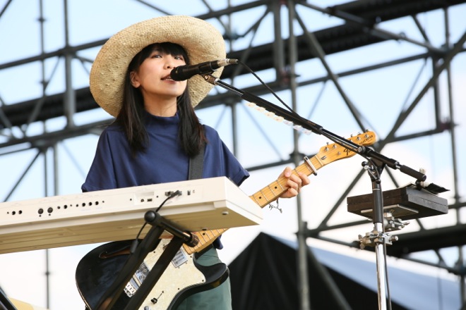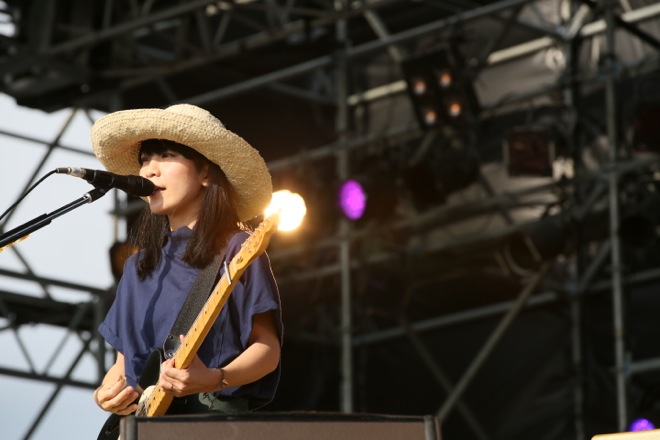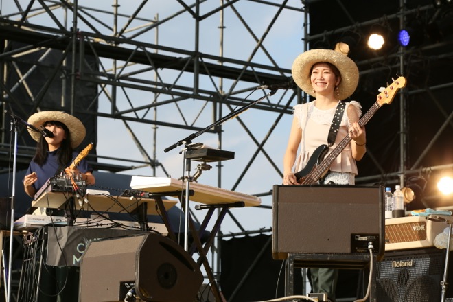 そのまま2曲目「8cmのピンヒール」へ。橋本絵莉子ののびやかな歌声が沖縄の爽やかな潮風に乗って遠くまで広がっていき、後方のフリースペースでくつろいでいるカップルやファミリーも心地よさそうだ。