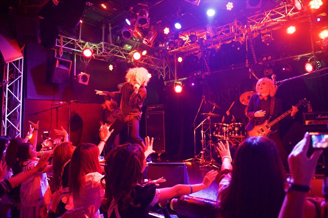イベントのトップバッターを務めたのはDiSPiИA。元々、暴動ともいえる激しく狂ったライブに定評があるバンドだが、この日もステージに現れるや否や1曲目からフロアにヘドバンの嵐を巻き起こした。ハロウィンということでほとんどの観客が各々コスプレを楽しんでいたのだが、歪月(Vo)は「ハロウィンが嫌いなんだよ」「つまらないんなら見なきゃいいのにな!」など挑発。途中、歪月がフロアに下り観客を直接煽る場面も。DiSPiИAは激しく重い楽曲を聴かせるだけでなく、そこに罵声と怒号をクロスさせた“従わざるを得ない”怒涛のライブパフォーマンスを完遂した。