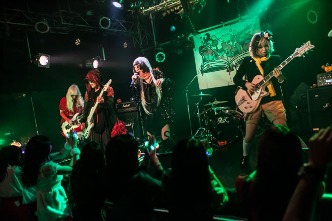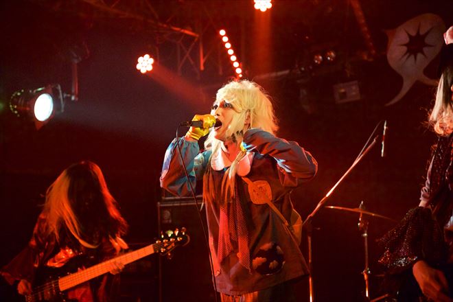 3番目に登場したのはマーブルヘッド。会場には幼稚園児のコスプレをしたファンがたくさんいたのだが、それは普段幼稚園児の衣装を着てライブを行なっているマーブルヘッドに合わせてのこと。そんなマーブルヘッド自身は、全員が錬撕(Vo)のコスプレと称して錬撕の過去の奇抜な衣装を身にまとう。玉城総司(Ba)に至っては顔面白塗りだ。ステージングもその派手な出で立ちに負けずとても激しく、ユーモアと毒を含んだ楽曲で会場は大盛り上がり。マーブルヘッドの楽曲はラジオ体操のフレーズや童謡などをアレンジして組み込むなどかなり独特。MCでも軽快なトークが繰り広げられ、一度見たら忘れられないインパクトのあるステージだった。