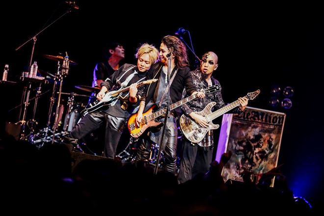 イベントもいよいよ中盤、ここで登場したのはAKi。楽器陣の後に悠々と登場する姿は、一気に会場中の目を釘付けに。1曲目は「Sing it Loud」。そのタイトルどおり、歌うことを宣言するかのように、堂々と歌声を聴かせていく。「頭振れ、品川!」「熱くいこうぜ」と煽りつつも、カッコつけすぎないところが、たまらなくカッコいい。男らしさ全開でスタートした「STORY」では、オーディエンスも力強くこぶしで応え、AKiもまた全力でぶつかっていく。そんなぶつかり合いが楽しくてたまらないらしい。終始この空気感を楽しんでいる様子を振りまいていた。MCでも「YUKKEおめでとう」と言いつつ、「祝い殺してやる」と物騒なことを口にしたり、ファミリーでこういったライヴができる楽しさをしみじみ噛みしめたりと、ご機嫌な調子で言葉が口をつく。