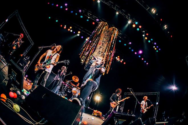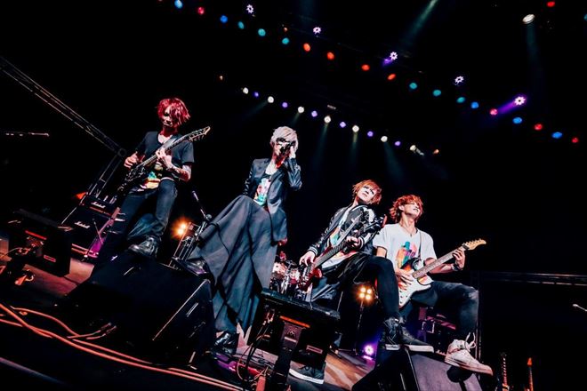 その後は、「Cage」(Dir en grey)、「88」(LM.C)、「ヴァンパイア」(Janne Da Arc)といった、5人バンドならばやってみたかったというYUKKEセレクトの曲が並び、バースデーイベントにふさわしい盛り上がりを見せていたところ、いきなりおかわりのOKが。タイムテーブルにもない展開に、まずは「EVOKE」を再び。さらに「大嫌い」では、本家本元である逹瑯(MUCC)が登場。出るつもりがなかったから髭もそってないとマスク姿の彼は、曲が終わると共に風のように去っていった。