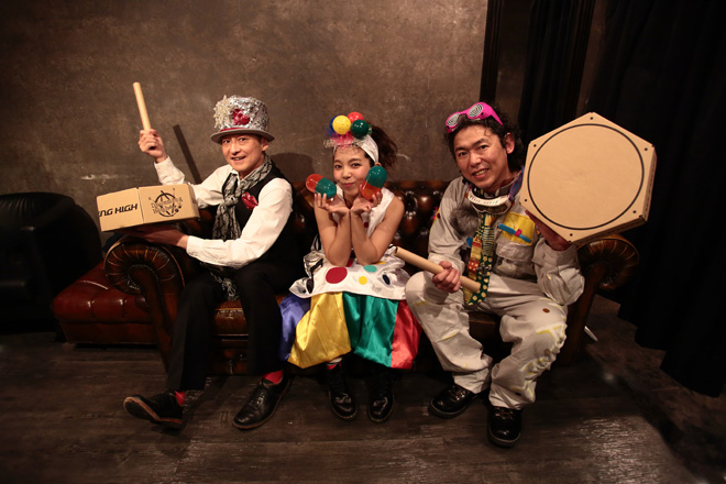 <ドラミングハイ!>に登場メンバーは、伝説のロックバンドJUDY AND MARYのドラマー五十嵐公太、世界的ファシリテーター酒井麿、キュートなスティールパン奏者オカピという3人のドラマー/パーカッショニストだ。<ドラミングハイ!>は、3人が繰り広げる音楽の物語に合わせて、お客さんもダンボールドラムを叩いて参加するという、観客参加型アトラクションイベントである。