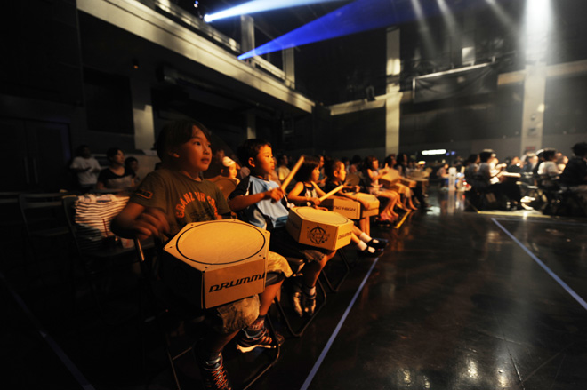 合言葉は“ただ叩くだけ”である。リズムとかビートとかグルーブとか、難しいこと/めんどくさいことは一切なく、何も考えなくていい。<ドラミングハイ!>のいいところは、大人から子どもまで誰もが無我夢中になれる、非常にプリミティブな体験イベントであることだ。。