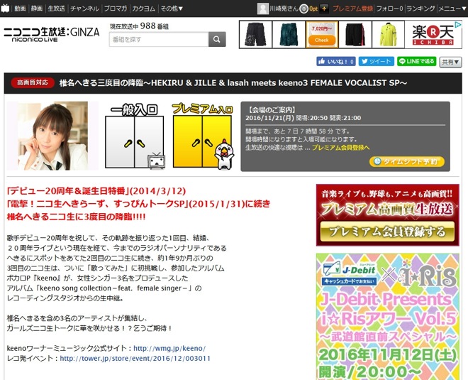 椎名へきるニコ生3度目の降臨。keeno楽曲カバーAL参加JILLE、lasahとガールズトーク