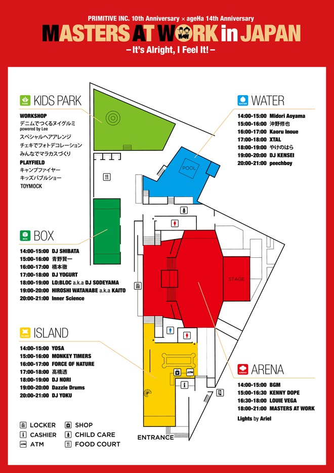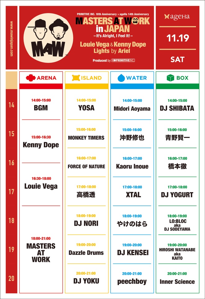 その存在は世界でも唯一無二、ハウスミュージックを軸に音楽の可能性を強力に拡げた史上最強のユニット MASTERS AT WORKが今週末11月19日(土)のお昼から新木場ageHa@STUDIO COASTにて<MASTERS AT WORK in JAPAN – It’s Alright, I Feel It! ->を開催、そのタイムテーブルとフロアマップが公開された。