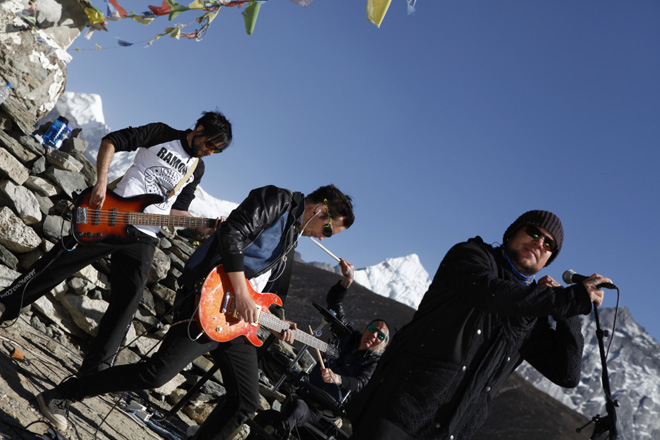 最初の予定だったエベレストのベースキャンプ標高5364mでは演奏許可がとれず、許可が取れた標高約4500mのネパールのディンボチェ村でライブを行うことに。ここまでたどりつくのに2週間かかったそうです。その間、多かれ少なかれ皆高山病に悩まされたとのこと。Sammy、Gary、同行した聴覚障害のあるラッパーsignmarkと撮影スタッフはベースキャンプにも足を運んだそうです。