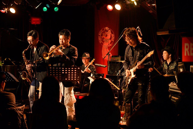 2nd setではゲストアーティストを迎え、スペシャルカバーセッションを聴かせる趣向でスタート、1曲目はMASAが今年音楽監督をした<テリーボジオ Live in Japan>でも演奏されたブレッカーブラザーズの楽曲「Some Skunk Funk」が披露された。その後、MASAがプロデュースをしてきたアンダーグラフとインディーズ時代にデモを作った彼らの代表曲「ツバサ」が、同時録音演奏特別バージョンでパフォーマンスされた。