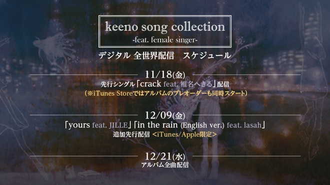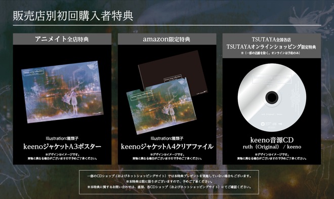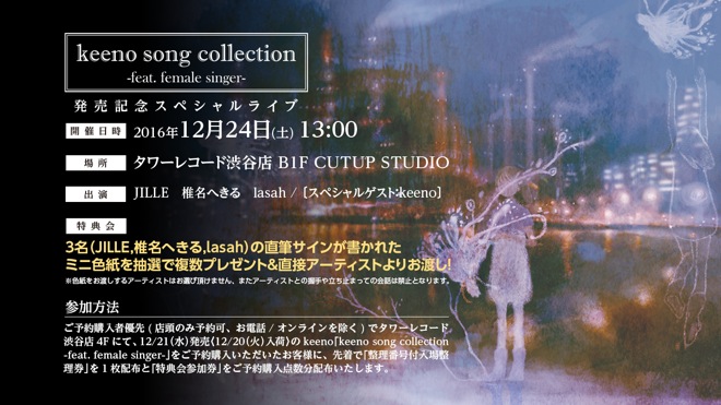 ・ご予約購入者優先(店頭のみ予約可、お電話/オンラインを除く)でタワーレコード渋谷店4Fにて、12/21(水)発売(12/20(火)入荷)のkeeno「 keeno song collection -feat. female singer-」をご予約購入いただいたお客様に、先着で「整理番号付入場整理券」を1枚配布と「特典会参加券」をご予約購入点数分配布いたします。