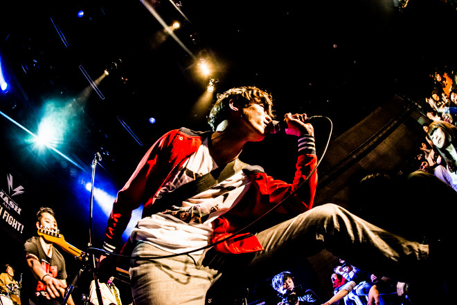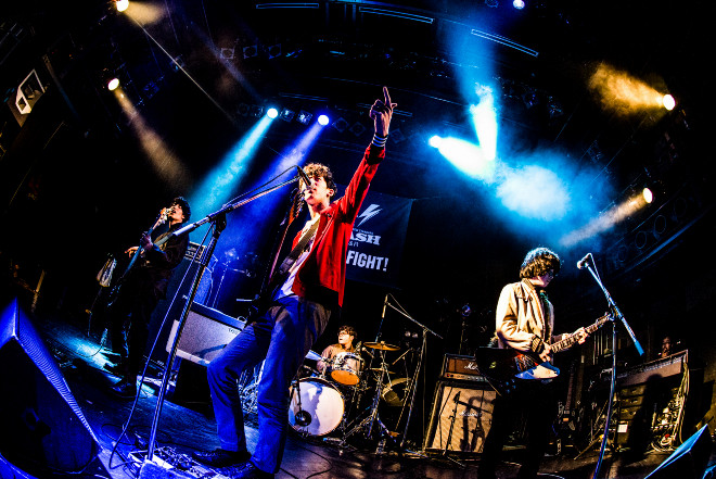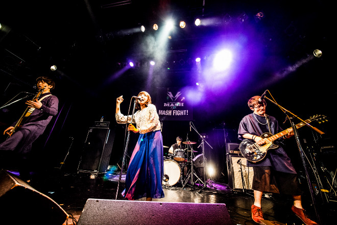 その結果を待つ間、ステージにはゲストとして去年のグランプリバンド、パノラマパナマタウンが登場。昨年は挑戦者として、今年は先輩として迎え入れる立場として出演となった。日頃のライヴではラストに披露することが多い「世界最後になる歌は」をど頭に持ってきてまさに臨戦態勢モード。「よろしく!」と軽快に叫ぶと、エンジンがかかったように岩渕の口上が滑らかに進んでいく。ロックとヒップホップを融合した異質なサウンドが異様な熱気を孕んで会場を彼らの世界に巻き込んでいく。昨年の彼らには想像もできないほど濃厚で新鮮な音楽体験を積んだ1年だったことが、演奏の厚みとこのバンドが持ち続ける純粋な攻撃性が物語っていた。「(MASH FIGHT!Vol.4で優勝した)1年前から僕達満足していないです。パノラマパナマタウンがいるMASH A&Rって言われたいんで、全員ついてきてください」とギラついた情熱を瞳に灯し、先日のツアーから披露され始めた新曲の「Odyssey」を演奏。大人と少年の間のような複雑で曖昧な感情が音像に表れたようなミドルなナンバーがとても新鮮で彼らの新たな魅力が見えた。続いて浪越の放つレーザーのように鋭いギターサウンドに撃たれるように岩渕が体をくねらせる「RANDOM BEAT」では再びフロアに降り立ち、会場は沸点を超えて盛り上がりを見せる。1年前のステージでも演奏された「SHINKAICHI」は確実に頼もしくなって響き渡り、先輩として圧巻のライヴとなった。