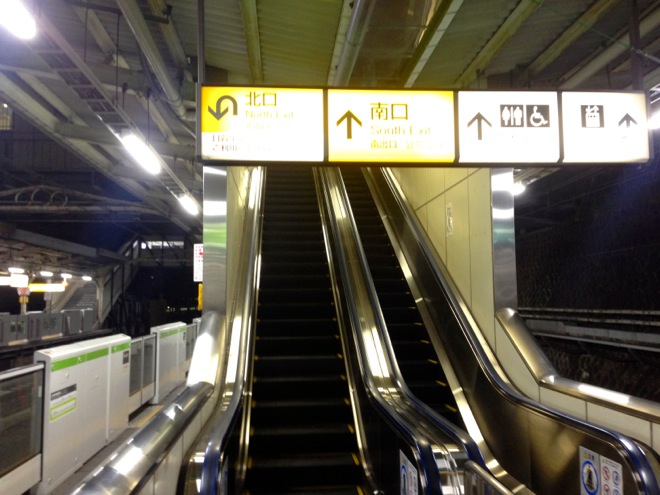 ホームから南口へは上りエスカレーターもしくは上り階段で行けます。下っている人、そっちは北口よ。