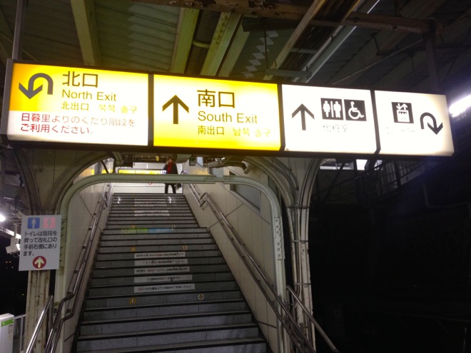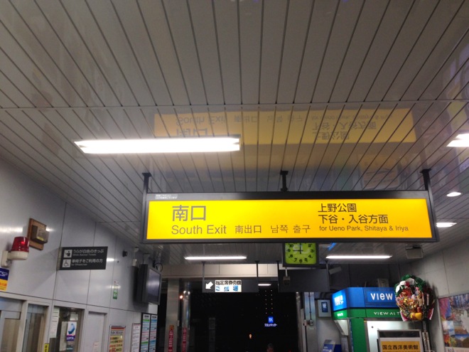 鴬谷(うぐいすだに)という駅はJR山手線か京浜東北線という電車で辿り着けるはずです。まずは南口を目指しましょう。この看板を見たら上野と書いてある方向に進むと南口に出ます。