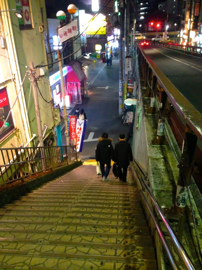 橋を越えたら階段です。降りたらもうすぐキネマ倶楽部!だかこそらお気をつけ遊ばせね。心が急いて転落する恐れがあります。落ち着くこと。1段降りるごとに、LOVE、ボヘ、LOVE、ジャン(推しメンの名前でも、まあ良し)と、唱えながらゆっくり降りましょう。ドキドキしてかえって危ないです。