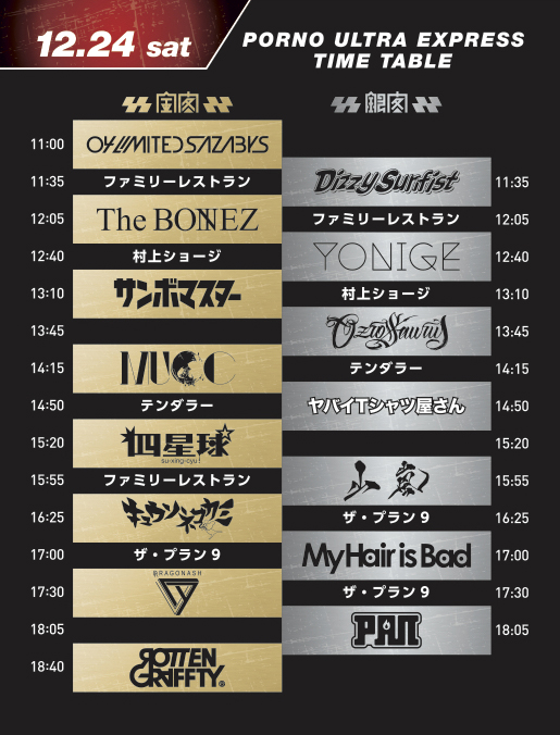 ROTTENGRAFFTYが2016年12月24日(土)、25日(日)2日連続で主催開催する冬フェス<ポルノ超特急2016>のお笑い芸人を含めた全出演アーティスト&タイムテーブルが発表された。