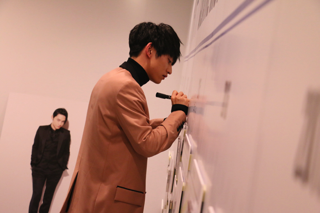 会場内は、SKY-HIのキャリア10年がわかる「年表ゾーン」、過去の選りすぐりの名言が展示された「名言ゾーン」、新曲のMV撮影で実際に使用されたセットが展示された「Double Downゾーン」と大きく3つに分かれており、SKY-HIはそれぞれに思い入れがある様子で随所に足をとめた。