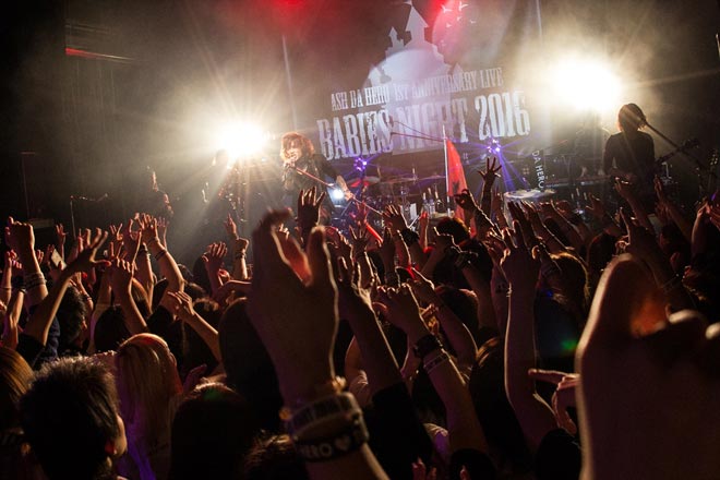 2016年12月9日、東京・WWW Xは祝福とか愛とか優しさとか、とにかくたくさんのあたたかい想いで溢れていた。この日のコンセプトは“ASHのお城へようこそ”。ロビーにはASH DA HEROのこれまでのポスターや額入りのライブ写真が飾られ、ドリンクカウンターでは特製ドリンクが用意されるなど、ベイビーズ(※ファンの総称)へのおもてなしはバッチリ。ステージにはASH DA HEROの旗がはためくお城がデザインされたバックドロップが張られ、大きな存在感を放っていた。