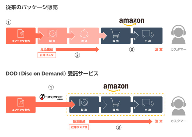 このサービスは、デジタル音楽のディストリビューターを務めるチューンコアジャパン株式会社が2016年12月15日よりスタートさせたもので、ユーザーがAmazonで注文すると、CDを1枚から生産し即時に出荷してくれるという。Amazonが提供するディスク・オンデマンドの仕組みと連携することで実現となったもので、これまでのように見込み生産や、流通により発生する在庫リスクが全く不要となる画期的なシステムだ。