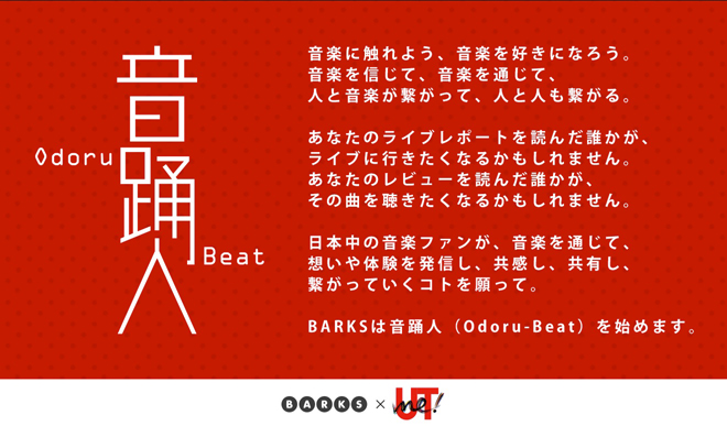なおBARKSでは「音踊人(Odoru Beat)」と題し、皆さんの「音楽体験」を募集中です。ライブレポートやディスクレビュー、お気に入りのアーティストやお勧めライブハウスの紹介など、140文字ではまとめることのできない熱い想いを文章にぶつけてみませんか? お待ちしております!
