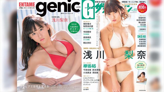 真っ白な水着で登場した『グラビアザテレビジョン vol.49』はなんと、AKB48グループ・乃木坂46・欅坂46以外でソロで表紙に登場したのは今回の浅川が、約7年半ぶりだという。真っ赤な水着で登場した『ENTAMEgenic』は表紙と裏表紙がつながっており、本を広げると浅川の全身写真が登場する仕掛けになっている。