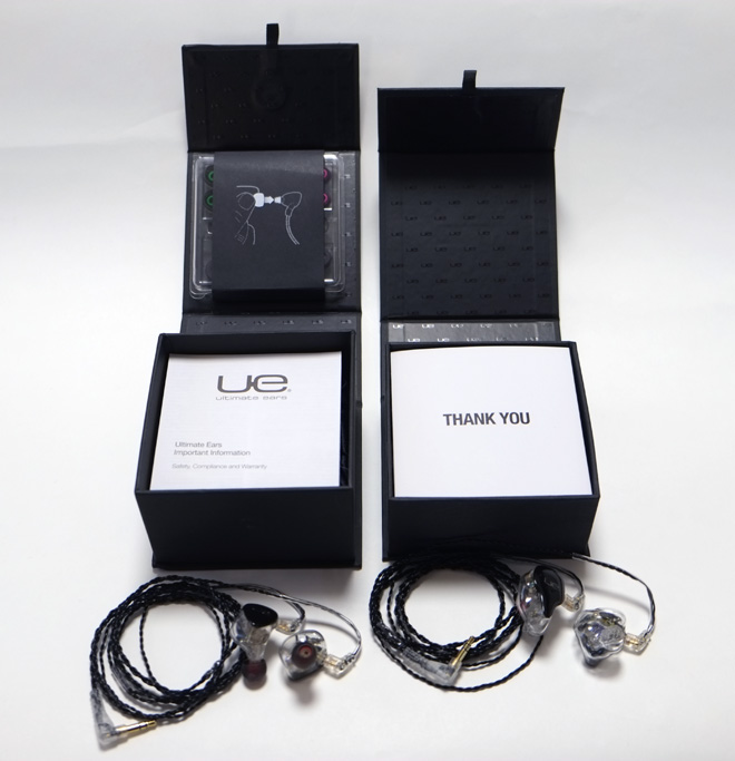 ▲左がユニバーサル、右がカスタムIEM。ユニバーサルには別途イヤーチップ・セットが同梱しているため、その分ボックスも大きくなっている。