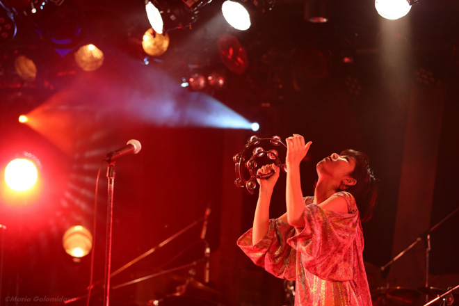 オリエンタル・ムード漂うインタールード「Lakshmi」をSEに、KANAME(B)、横内”TAKE”健亨(G)、富岡”GRICO”義広(Dr)が登場し、ライブの序章を告げるセッションがスタートした。ウォームアップさながらのラフな雰囲気を醸し出しながらも、これから始まる怒涛の展開への片鱗を覗かせる。