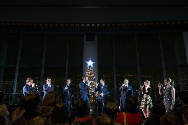 今回のライブは、「VOCES8 Xmas NIGHT OUT」と題され、普段はコンサートホールで活躍する彼らが“街に繰り出してクリスマスの夜を歌声で彩る”という意味を込めたプロモーション・イベントの一環。地上350mの天望デッキから見える絶景をバックに約40分に渡って繰り広げられた。