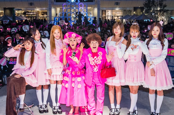 3曲目にしてラストナンバーとなったApink初のクリスマスソング「My First Love」を熱唱中のステージ上に、メンバー以上に派手なピンク色をまとった二人組が乱入。歌うメンバーを許可なく撮影しまくるのは、“ピンク系タレントの元祖”とも言える林家ペー&パー子のふたりだった。