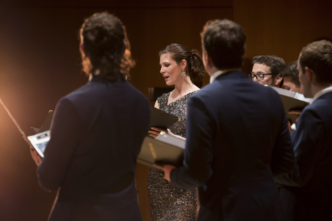 次のポップスパートでは、空気がガラリと変わる。披露されたのはナット・キング・コールの「ストレイテン・アップ・アンド・フライ・ライト」だ。ステージ横から一人ずつがステージ中央に集まっていき、ハーモニーを少しずつ重ねていく。ボイスパーカッションとスキャットのベースライン、コーラス、そしてリードボーカルが折り重なって厚みを増していき、ジャジーなナンバーが繰り広げられる。緊張感に包まれていた会場は一転してリラックスした雰囲気になり、ところどころで身体を揺らして楽しむ観客も。