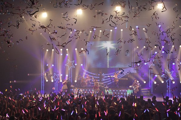 ライヴ後半戦では彼女たちにとって初トライのアコースティックコーナーが設けられた。このコーナーでは全員が楽器をチェンジ。赤いアコギを持った愛美が「ポジションマークが星になってとてもかわいいです」と言うと、大塚が「お揃いの青いアコギです」と紹介。通常のアコギよりボディが薄くて弾きやすいと話していた。鍵盤ハーモニカを持った伊藤は「小学生以来、触ったんですけど、意外と肺活量が鍛えられるから小学生って大変だな」と笑わせ、大橋は「私はパーカッション系をやらせていただくんですが」と猿の(デザインの)鈴とウィンドチャイムの音を鳴らしてアピール。初のフレットレスベースにチャレンジした西本も「滑らかなんですよ」とブーンッと弾いて歓声を浴びていた。そんな楽器編成で披露されたのはカントリーテイストにアレンジされた「ぽっぴん’しゃっふる」のアコースティックヴァージョンと伊藤が電子ピアノにチェンジして演奏されたハーモニーも美しい「STAR BEAT!~ホシノコドウ~」で、5人の挑戦に力強い拍手が沸き起こった。