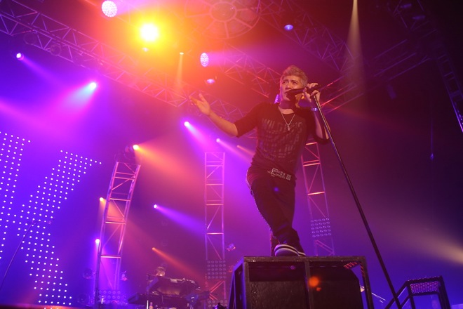 前半は最新アルバムからのナンバーが続く構成。突き上げられるたくさんのこぶし、大声での歓声、飛び散る汗……体育館らしい熱い熱い盛り上がりだ。5曲目の「Oh, Yes!!」が終わったところで、この夜最初のシンバルキックが炸裂したのだが、吉川は勢い余って頭から床に直撃した。