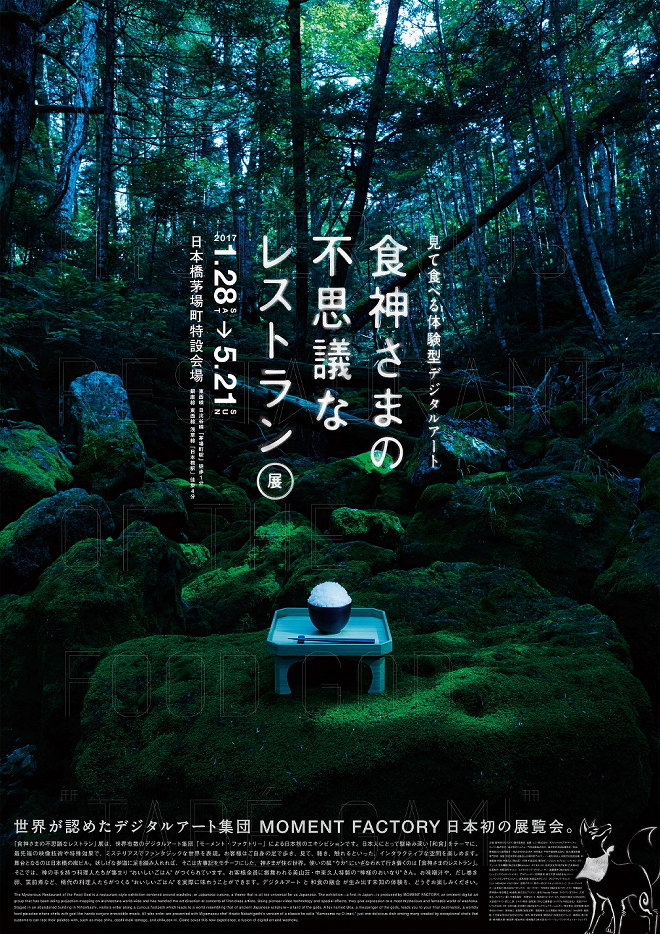 同展覧会は、マドンナらのライブ演出をはじめ、サグラダ・ファミリア大聖堂、シルク・ドゥ・ソレイユ、ディズニー、ソニーなどのショーや体験型イベントを手掛けてきたことで知られるデジタルアート集団「モーメント・ファクトリー」による日本初のエキシビションとなる。“世界から見た和食を通じて日本の食文化を知る”をコンセプトに、映像やインタラクティブコンテンツで和食の魅力を体感し、中東久人(野草一味庵「美山荘」)、村田吉弘(京料理・懐石料理「菊乃井」)、ジョエル・ロブションらの監修による料理を実際に味わうこともできる体験型のデジタルアート展だ。なお、展覧会のガイド役・ウカのボイスキャストを乃木坂46の“食い気担当”松村沙友理と“アート担当”若月佑美が担当することも見どころのひとつとなっている。