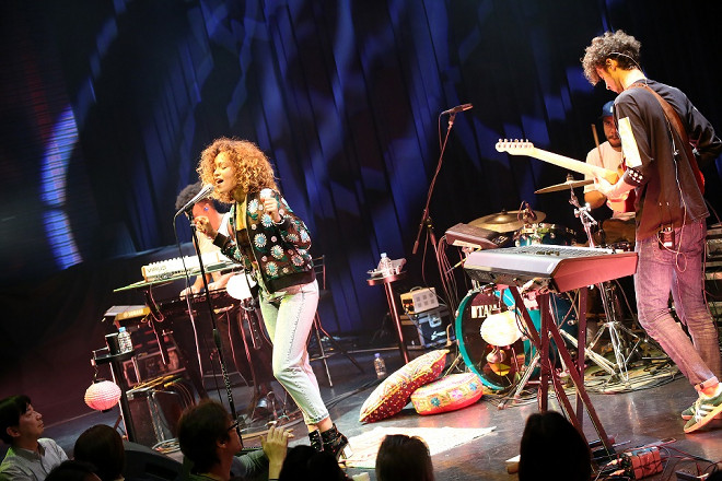また、最初は少し緊張しているように見えて、マイクの前からあまり動かなかった彼女だけど、後半は俄然リラックス。ステージを広く使い、鳥のさえずりみたいな独特の高音はさらに軽やかになってゆく。幅広い年齢層を網羅したオーディエンスも、イジーの親しみやすい佇まいにどんどん打ち解けて、手拍子でパーカッションを肉付け。このようにゆっくりと自然に、お互いのテンションを上げていくのが、彼女のスタイルらしい。