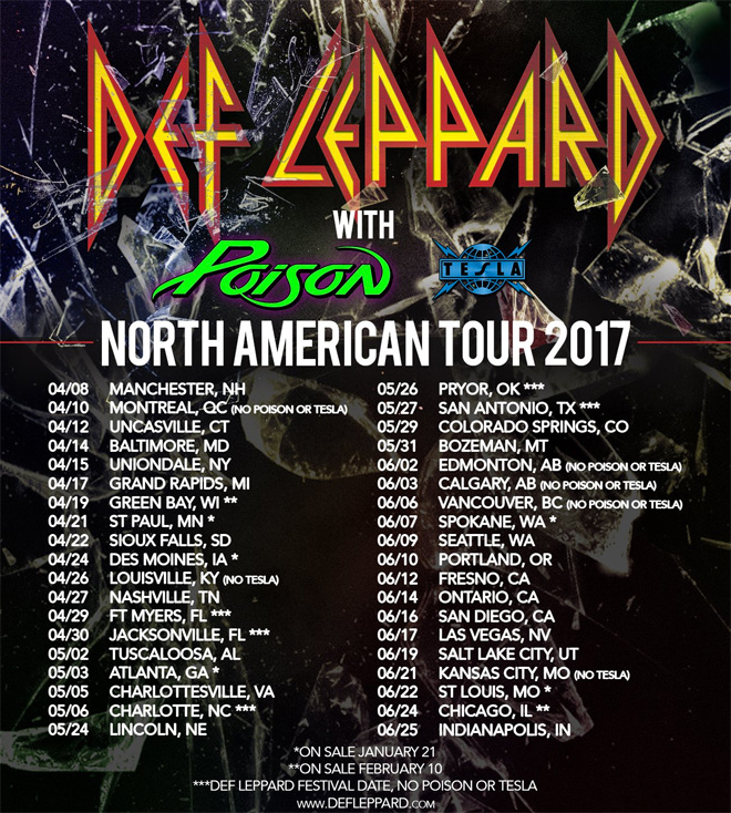 ポイズンのフロントマン、ブレット・マイケルズは「#BretMichaelsは、C.C.、ボビー&リッキー(オリジナル#POISON)と@DefLeppard & TeslaLiveのツアーに参加する」と、テスラは「俺らの友人@DefLeppard & @PoisonTweetsと2017年春ツアーをやることに興奮している!」とツイートした。
