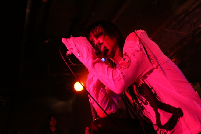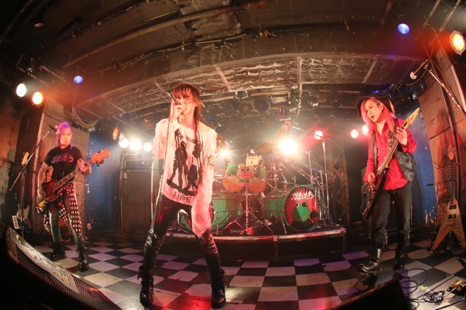 定刻を15分ほど過ぎた頃、唐突に流れ出したSEと同時に、ステージに姿を現したのはメンバーとの親交も深い“猫ひろし”だった。この日は友情出演としてライブの前説に登場、得意のギャグで会場を爆笑の渦に巻き込んでいく。ほどなくお馴染みのSEが場内に流れ、怒号にも近い歓声の中、まずはKENZI(Dr)が拡声器を持って新宿LOFTをアジテーション。続けてMOGWAI(B)、屍忌蛇(サポートギター/from VOLCANO)が登場し、オープニングナンバー「199Q」の曲中でSCEANA(Vo)がステージに。いよいよ4半世紀ぶりワンマンライブの幕が切って落とされた。