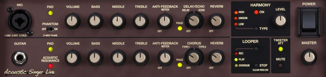 「Acoustic Singer Pro」、「Acoustic Singer Live」は、ピックアップを搭載したアコースティックギター用と、ボーカルマイク用の入力を独立して持つ2チャンネル仕様となっており、高音質かつパワフルなサウンドと最適な音量バランスで演奏が可能な、弾き語りに最適なアンプ。