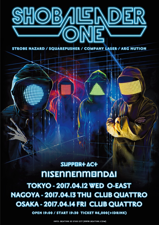 昨年2016年末にワールドツアーが発表され、アルバムの存在をほのめかすトレーラー映像とともに、本格始動が明らかになったショバリーダー・ワン。この超絶技巧バンドは、主宰のSQUAREPUSHER(ベース)、ARG NUTION(ギター)、STROBE NAZARD(キーボード)、COMPANY LASER(ドラム)という覆面の凄腕4人で構成される。