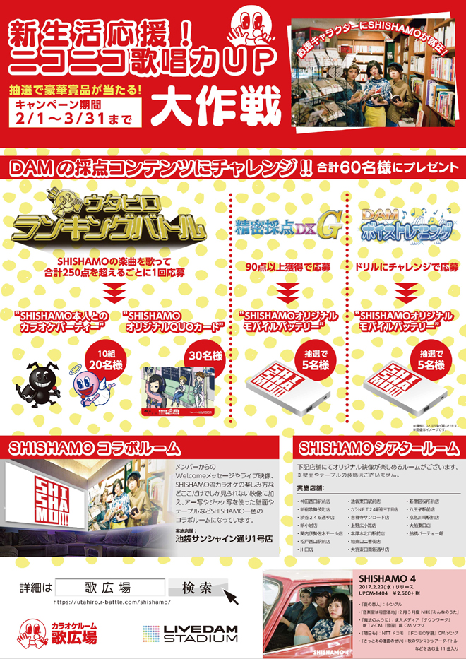 SHISHAMOが応援キャラクターを務めるキャンペーン「新生活応援!! ニコニコ歌唱力UP大作戦 Supported by LIVE DAM STADIUM」が、カラオケルーム歌広場で2月1日よりスタートする。SHISHAMOメンバーとのカラオケパーティーをはじめ豪華賞品が抽選で当たるプレゼントキャンペーンに加え、池袋サンシャイン通り1号店にはSHISHAMOのコラボルームが登場。映像が楽しめるシアタールームも実施する。