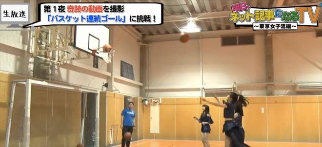バスケット連続ゴールでは、指定された20分の間に4連続ゴールを決めるべく、メンバー同士で戦術を出し合い何度もシュートを放つ。なかなかゴールが決まらないながらも、制限時間終了間際、キレのある連続ゴールを決めることに成功する。