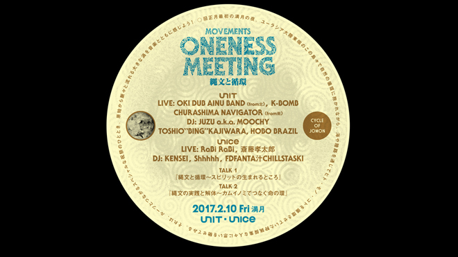 2月10日満月の夜に、代官山UNIT&UNICEにて「縄文と循環」をテーマにしたパーティ<MOVEMENTS ONENESS MEETING 縄文と循環 CYCLE of JOMON>が行われる。