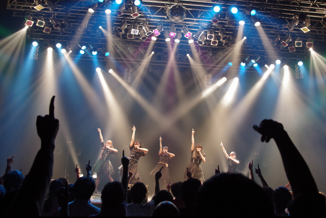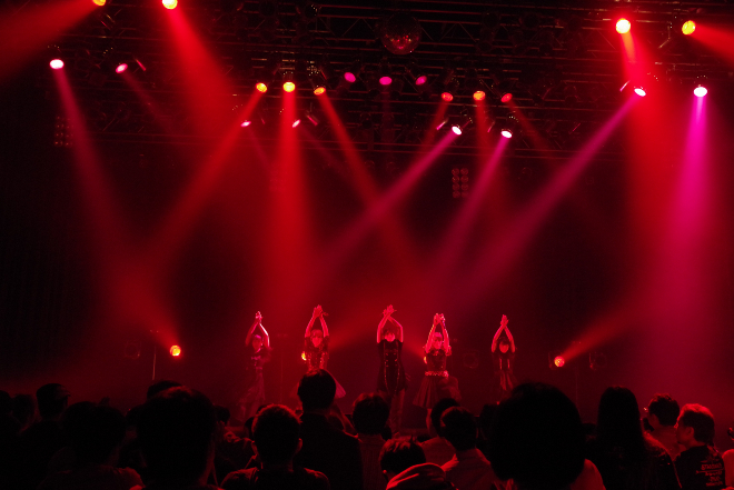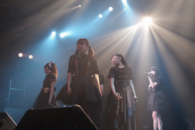 この日は中野サンプラザ公演でも披露した漆黒の衣装を身にまといステージへ。イベントならではのショートプログラムとなった本公演は「サーカスを殺したのは誰だ」で幕を開ける。2曲目「スペル・オブ・ザ・ブック」では会場をダークな世界へ引きずり込み、3曲目では一転、ミディアムバラード曲「賢者のローブ」を披露。ラストは新曲「ホシノテレカ」で締めくり、彼女たちが武道館宣言から歩んできたこの一年半の間に培った自信と、それを下支えする実力を見せつけた。