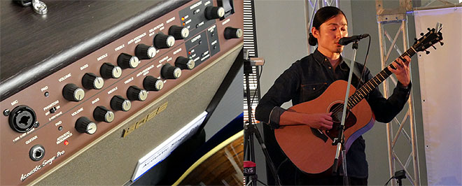 ▲フロントパネルにはコンボジャックのマイク入力とギター入力を用意(左)。つまみは上がマイク用、下がギター用とわかりやすい配置。デモはbonobos、LITTLE TEMPOのギタリスト小池龍平さん(右)。ルーパー機能を駆使してマイクからの声などでリズムを構築、その上にギターや自動ハーモニーを加えたボーカルを乗せ、とても1人とは思えない豊かなアンサンブルを聴かせた。