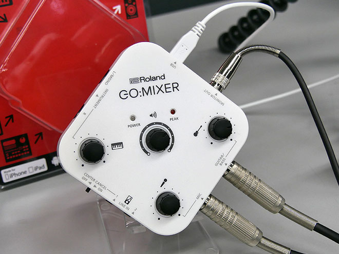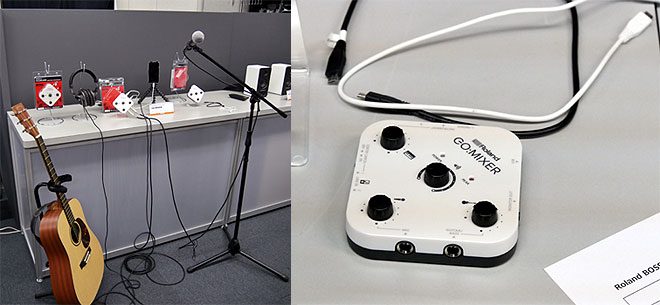 ▲カジュアルなブリスターパッケージで販売されるGO:MIXERはマイクやギター、スマホとともに展示(左)。サイズは縦横95mmで厚さは28mm、重量は100g