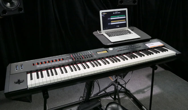 注目は、現代のステージや制作現場に対応するマスターキーボード機能。PCを含む外部音源のパラメーターや音色切り替えを本体パネルで操作可能。さらに最大24bit/192kHz対応のオーディオインターフェイス機能も搭載し、PCからのサウンドと「RD-2000」本体のサウンドをミックスして出力したり、SUB OUTを利用して別々に出力することも可能。PCとの接続がUSBケーブル1本で済むのもポイントだ。「RD-2000」は250,000円前後で3月発売予定。
